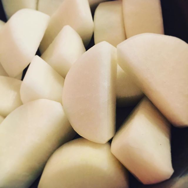 大根の皮をむいて、面取りして、あー、美しいなあ、と。今日はブリ大根ですよ!面取りした部分は賄いのサラダに、むいた皮はキンピラに。大根は偉い!(麻)
