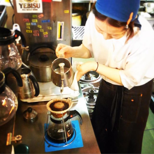 先日来コーヒー修行に励んでおりました新スタッフの井上さん!いよいよ本日コーヒーデビュー!と開店前に五人前淹れてもらってます!(お)