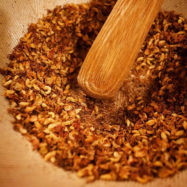 午後は店長ミヤザキ、すり鉢の中に花山椒…ごりごりすって、本日の新メニューはさてなにが出来るのかしら?(お)