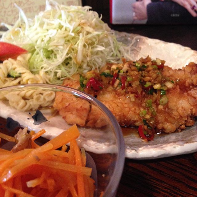 今日は、お客様が少なかったので早上がりしました。みんなより先にまかないいただきました。「鶏のから揚げ 中華香味だれ定食」です。にんじんのマリネをオマケしてもらいました。まだまだランチ間に合いますよ〜。お待ちしております。(い)