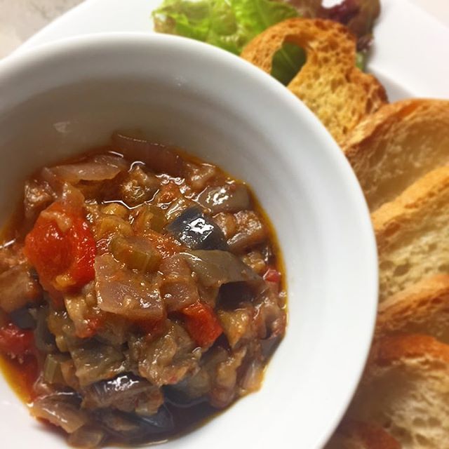 ラタトゥイユ、お好きですか?わたしは好きなんですけど、メニューでお出ししてもあまり注文されないんです。と、気づくと今うちのメニューって和食中心の季節で、存在が浮いちゃうみたいですね。でもせっかく作ったので今週はしつこく出していきますよ。湯むきしたトマト、下揚げした茄子、黒焼きにして皮をむいたパプリカ、それぞれ別に炒めてから合わせる玉ねぎ、セロリ。下ごしらえのひと手間が美味しく馴染んだラタトゥイユになるわけです。メルバトーストは、焼いたバケットにニンニクをすりつけたもの。ワインはもちろんビールにも、軽めの日本酒でも良いと思います。ブロッコリーと自家製ツナと半熟たまごのサラダから、レバーペースト、そしてラタトゥイユなんて流れでいかがでしょう。(麻)