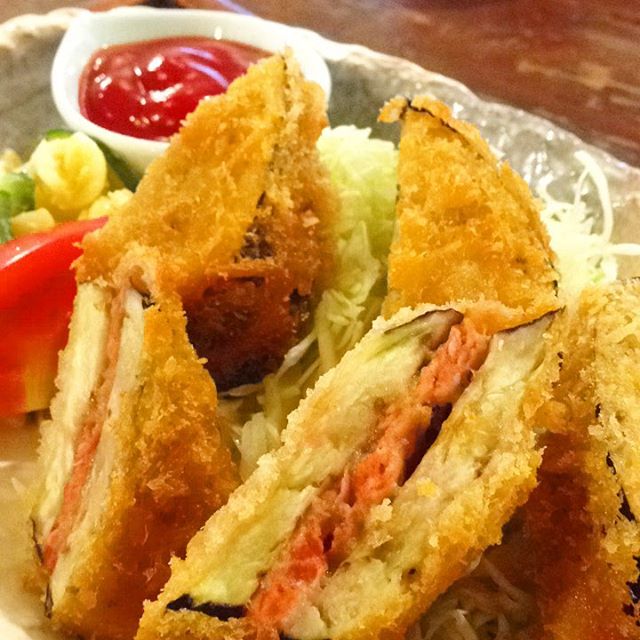 今日のまかないは「茄子のサンドフライ定食」です。そのまま食べてサンドフライ、茄子がズレてお肉だけになるとメンチみたい。二度おいしいと思うのは私だけでしょうか?(い)