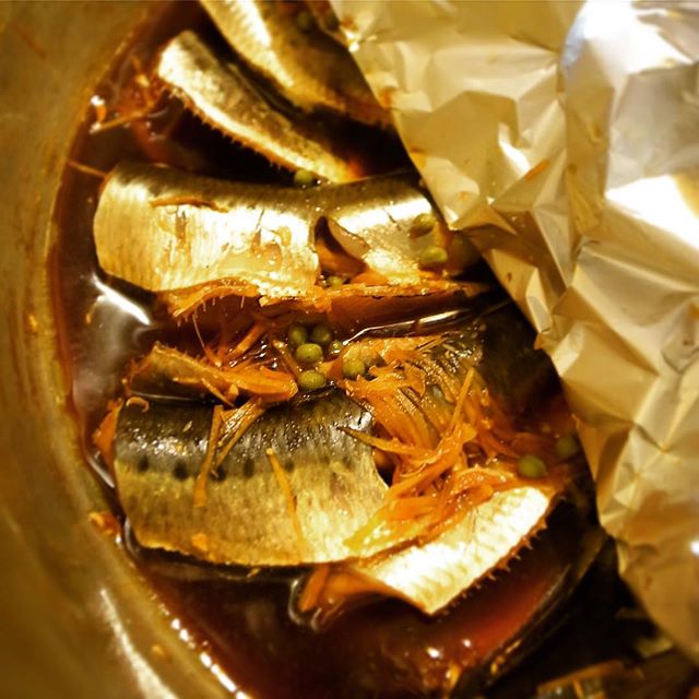 アルミホイルの落し蓋からチラリと「いわしの山椒煮」!明日のあるだけランチで登場ですよと、えぇ、ちなみに日替わりは「れんこんときのこの豚肉巻き揚げ」…みなさんのご来店、楽しみに待ってまぁ〜す!(笑)(お)