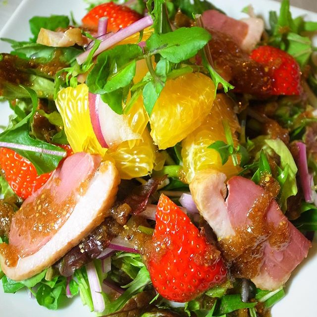 きらきら春のサラダは「いちごとはっさく、合鴨スモークのサラダ」!いちごとはっさく、ふたつのフレッシュでフルーティな酸味に合鴨スモークの風味と旨味!葉ものやさいとざくざく合わせたら、自家製バルサミコドレッシングで!うきうきいただきましょう!(お)