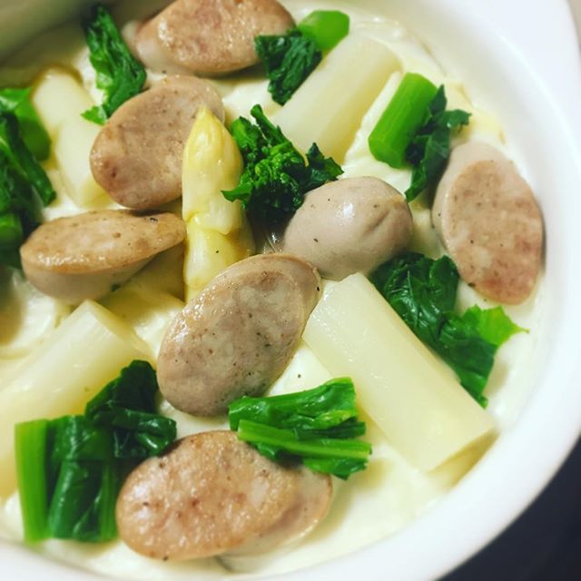 ホワイトアスパラーーーーッ!というわけで、今ならではのグラタン、ホワイトアスパラと新じゃがのグラタン、ご用意できました!合わせるのは白ソーセージと菜の花を少し。春爛漫のグラタンです。春の野菜のほのかな苦味が、しみじみ美味しいですよ!(麻)