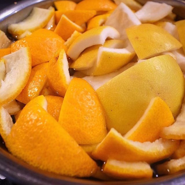甘夏と文旦の皮をひとまず水に漬けて…これから煮る作業に入るところ。あれこれ手間はかかるけど、おいしいんだよねぇ、これが(お)