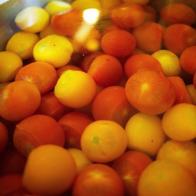 地味なメニューだけど人気だよ!とこれから湯剥きをするところと、冷水の中のミニトマトは、ゆらゆら金魚のようでもあり(笑)(お)