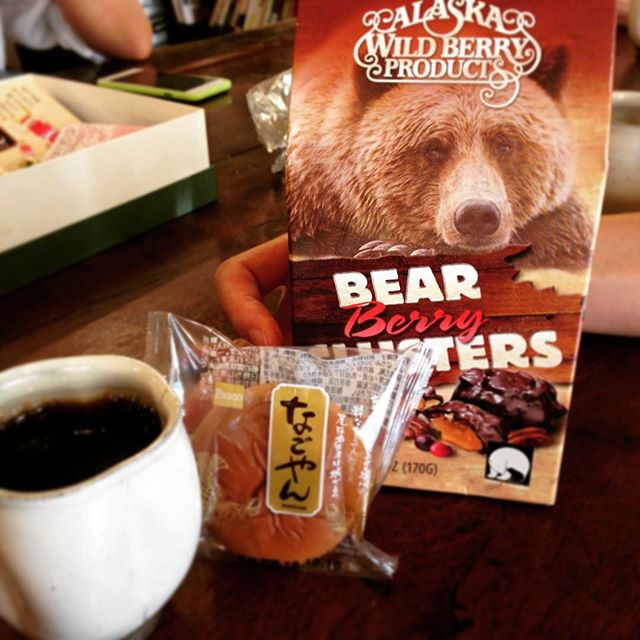 熊です!荒々しいパッケージのお土産をいただきました。ものすご〜く目につくので気になってました。アラスカ土産だそうです。中身もどっしりワイルドかと思いきや、大きさはどっしりでしたが程よい甘さの美味しいチョコ菓子でした。楽しいお土産ありがとうございました\(^o^)/。ちなみに「なごやん」は、なべさんのお土産です、黄味あんで美味しいですよ。名古屋に行かれたらぜひ。美味しいものは幸せ。。(うめ)