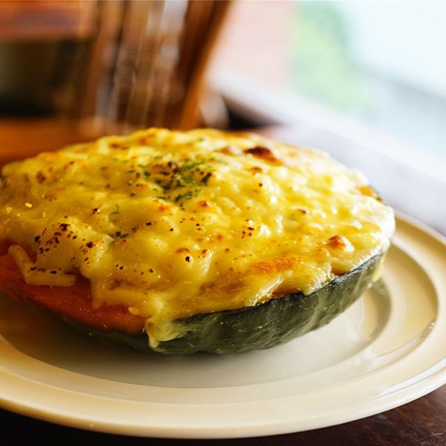限定13名様!坊ちゃんかぼちゃのスパイストマトソースグラタン、やります。明日の夜から、売り切れ御免です! 友人でお客さんのチカコさんから、おじさんが作ったという坊ちゃんかぼちゃをいただきました!甘くて美味しいかぼちゃ、半分に切ってそのままグラタンにしてしまいます!ワタをくりぬいたところに、スパイストマトソース(ミートソース!)をつめて、その上にキノコの入ったベシャメルソース、チーズたっぷりで焼き上げます。独り占めできる大きさ!皮まで食べられます!スタッフが「夢のあるメニューですね…」とウットリため息をつきました。ぜひ食べにきてくださいねー!(麻)