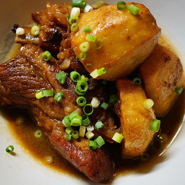 昨夜新登場はこちらもお肉!「豚スペアリブと揚げ里芋の黒酢煮」!いや、骨付きスペアリブの旨味に旬のねっちり里芋のおいしさ!黒酢で煮あわせて、夏の疲れにほっと効きます、おいしいね!(お)