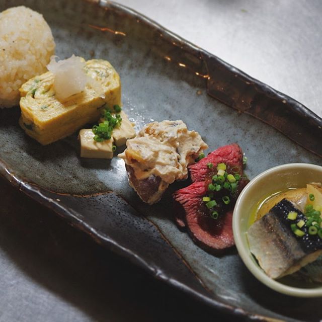 秋・あ・が・り・ちょ・こ・も・り!ついについに満を持して、始めちゃいましたよ!秋の日本酒秋あがり・ひやおろしにぴったりの、旬の肴をちょこちょこ盛り込みました!唎酒師ミヤザキの名にかけて、これ食べたいっ!ていう肴をラインナップ!内容は少しずつ変わっていく予定ですが、本日のラインナップは…和風ローストビーフ秋刀魚とじゃがいものコンフィ三つ葉入りたまごやきクリームチーズの味噌漬けぶどうと胡桃の白和えトリュフ塩・小おにぎりで、どや!秋あがり飲み比べセットとあわせて、もちろん飲めない方でもご注文いただけますよー。(麻)