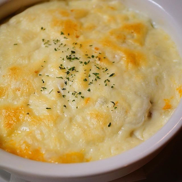 想像してごらん…焼きたてあつあつのチーズはとろ〜り、その中は湯気の立つホワイトソースにしっとり里芋はヤケドに注意!さらにスプーンをすすめると、お皿の底には旨味満点のミートソース…あつあつのまま渾然一体、お口に運ぶシアワセを(お)