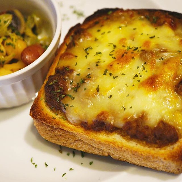 焼きたての写真じゃなくて申し訳ない…ひばりスターレストラン、本日も元気に営業中!あれ?ちょっと暇だなあ…こちらは本気のキーマカレーチーズトースト。豆のマリネを添えてお出ししております。軽食につまみにうってつけ!サクサクの角形食パンがカレーにぴったりなんでさよー!(麻)
