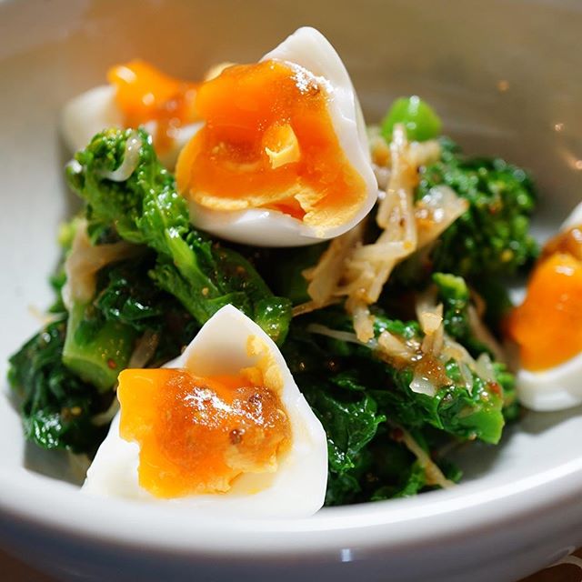 さてと今週の夜は韓国祭り!ってな当店ですが、サラダは春!「菜の花と山うど、半熟たまごのサラダ」!いや、春いっぱいは山菜の風味においしさ!まろやかな半熟たまごにオリーブオイルに粒マスタードのドレッシングがイイネ!(お)