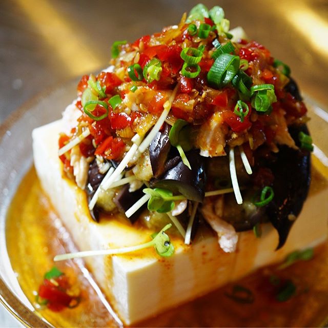 さてと高知メニュー以外も新メニュー!ひんやり豆腐は「茄子と蒸し鶏の辛味豆腐」は夏の人気「茄子と蒸し鶏のサラダに(辛味ぽん酢)」をのっけ盛り!ってな実は賄い的一品!旨し!(笑)(お)