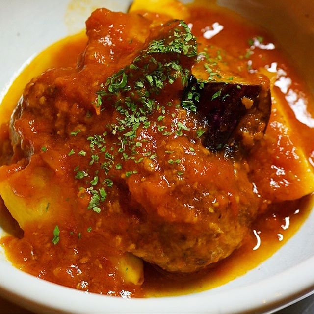 あー、雨は降らねど梅雨空続きはどうにも身体がしゃんとしませんね…ってな方にはトマトの酸味!「肉だんごとじゃがいも、茄子のトマト煮」がおススメ!旨口まろやかトマトソースに肉だんごのおいしさ!しっかりたべて元気にまいりましょう!(お)