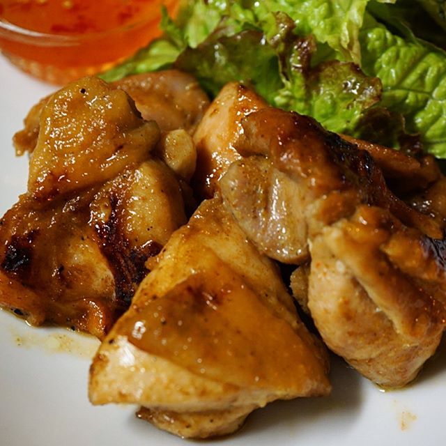 さらに夏の鶏肉メニューと言えばエスニックな「タイ風ハニーチキン」!にんにくとハチミツに漬けておいたやわらか鶏肉をじゅうっと焼いたら、お好みでスウィートチリソース!あつあつをどうぞ!(お)