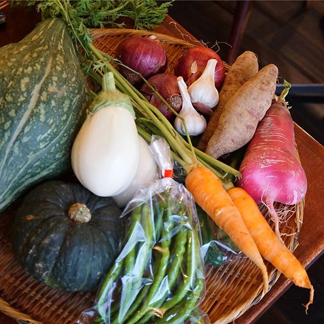 さてさて、忙しくしているうちにご紹介しそびれてました、今月の高知森田農園おまかせ直送便!まさにエッグプラントな白ナス、コレはすでにご好評につき売り切れました白ナスのマリネでお出ししました!かぼちゃは栗味かぼちゃと、ロロンの2種類!カラフル大根も美しい!サツマイモは土佐紅、柿味にんじん、にんにく、生姜はすでにおなじみ!さて、料理するのが楽しみです!(麻)