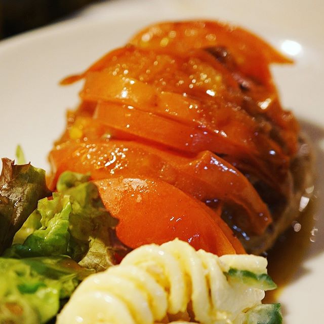 お待ちかね!梅雨明け8月は夏の特別ランチメニューは「フレッシュトマトのハンバーグ定食」!丸々トマトを1個のせて焼いたさっぱり夏のハンバーグ!お早めにぜひ!(笑)(お)