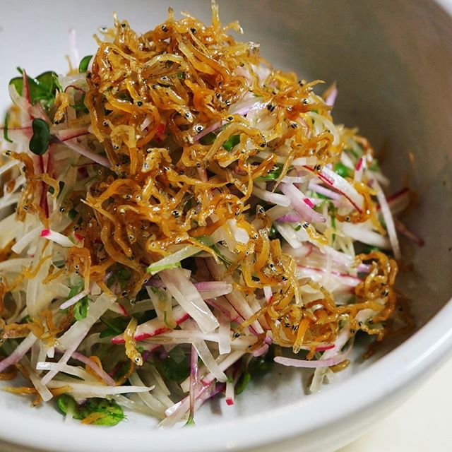 さてと新作夏サラダは「こうみやさいと揚げじゃこのサラダ」!さくさく千切りにした赤大根に緑の葉物香味野菜をあわせたら、カリカリに揚げたじゃこをたっぷり振りかけて、旨口にんにくレモンドレッシングでさわやかにお召し上がりっ!もりもりたべやさい!(笑)(お)