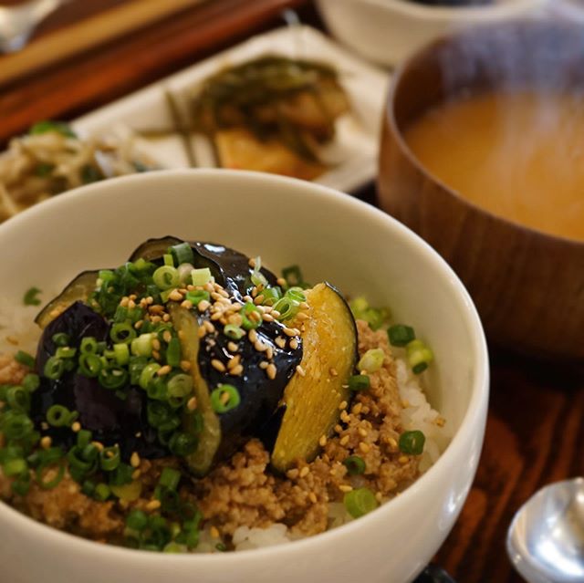 明日のランチは、夏の終わりのランチ御膳ーー!揚げ茄子の梅味噌そぼろどんぶり御膳です! 叩いた梅干しと味噌で味付けした豚肉そぼろは、さっぱりこっくり夏の身体にしみわたる旨味。茄子をさっと揚げてちょっと醤油を隠し味に。暑さに負けない身体づくりに、ぜひ!(麻)