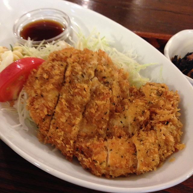 今日のまかないは「チキンカツ ハーブ風味定食」です。大きいチキンカツ!大満足です。(い)