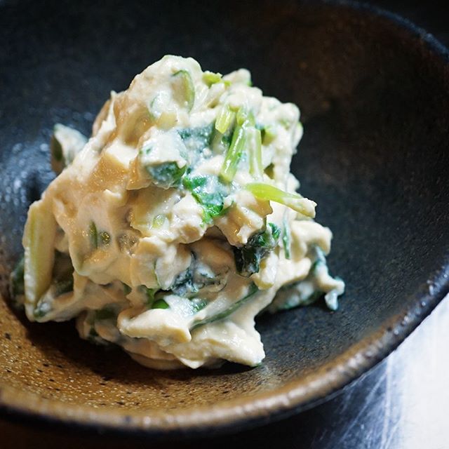 季節の白あえは新登場の「根三ツ葉とさとうざやの白あえ」!ぷりぷりお豆はさとうざやにさっと茹でた春の山菜の独特の香り!ごまの風味はしっとりなめらか、旨味いっぱいの白あえですよ!(お)