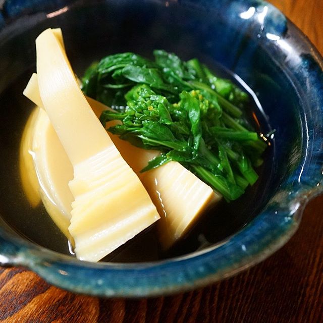 春はたけのこ祭りはじまるよ!と暖冬の今年は例年より10日以上?早くスタート!と、まずは新メニュー「たけのこと菜の花の煮びたし」!たけのこ穂先はやわらかさ、春のほろ苦菜の花と、それぞれいい感じに煮てから、やさしいお味の出し汁に煮合わせた春の一品!(お)