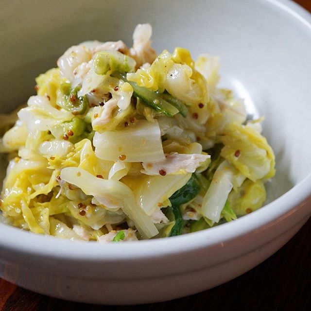 春のやさしいサラダは店長ミヤザキもお気に入り!「春キャベツと蒸し鶏のサラダ」さっと茹でした春キャベツのキミドリと蒸し鶏の控えめな旨味…つぶマスタードの効いたドレッシングがよく合いますよ!さっと前菜にぜひ!(お)