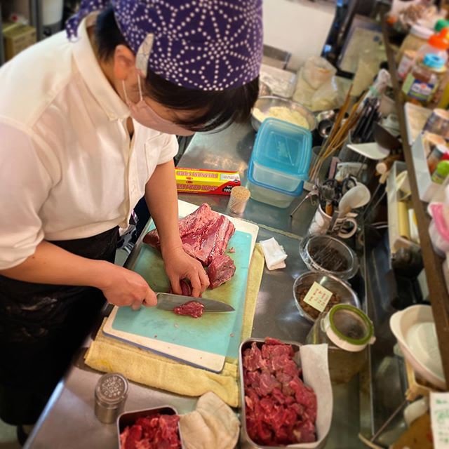 さてとGWもスタート?は昭和の日の祝日水曜日!とこんな時でも新メニュー!は「ビフカツとオニオンフライ」店長ミヤザキ下拵え中…お弁当でも単品でも!すでに売切必至??(笑)(お)