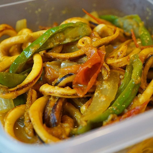 さてと雨の土曜日、今日のおススメは「イカのスリランカ風スパイス炒め」!と、いや、今週はインド方面のメニューが目白押し!スパイシーでもやさしいスリランカ風はイカにトマト、ししとうにたまねぎをじゃじゃっと炒めました!旨味満点!(お)