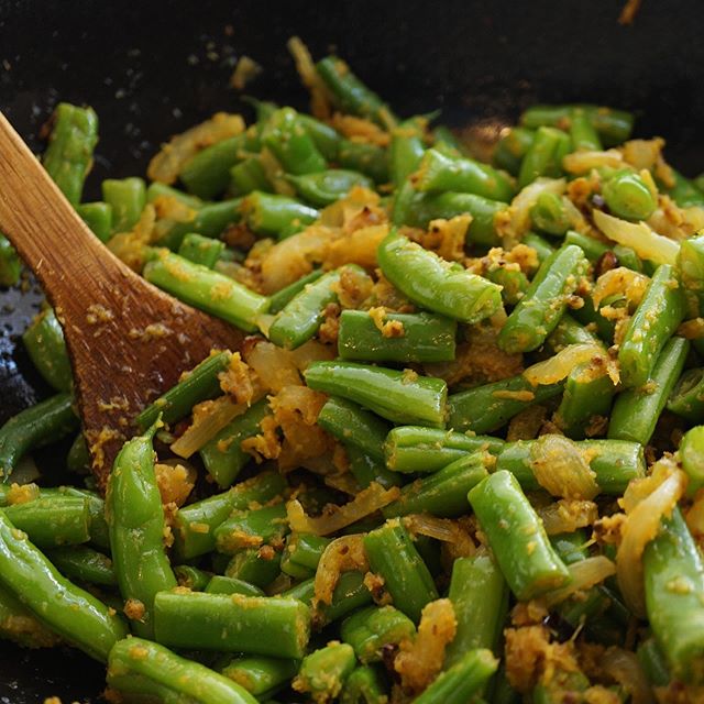 インドから離れられない店長ミヤザキ、たまたまお安くてプリプリのインゲン見つけた!ということで南インド方面のお料理、ポリヤルを。ココナッツファインと生姜、マスタードシードとターメリックで爽やかなスパイス使いが初夏にぴったりかと。いえ、今週の人気メニューローストポークと一緒にテーブルに乗っても違和感のないお洒落な味ですから!(麻)