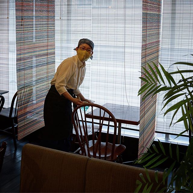 さてと先週からほんのりランチ営業も再開してますけど、流石に梅雨時ですからね、のんびりではありますが開店前準備はホールスタッフのウメさんがテーブル消毒に余念なし!(お)