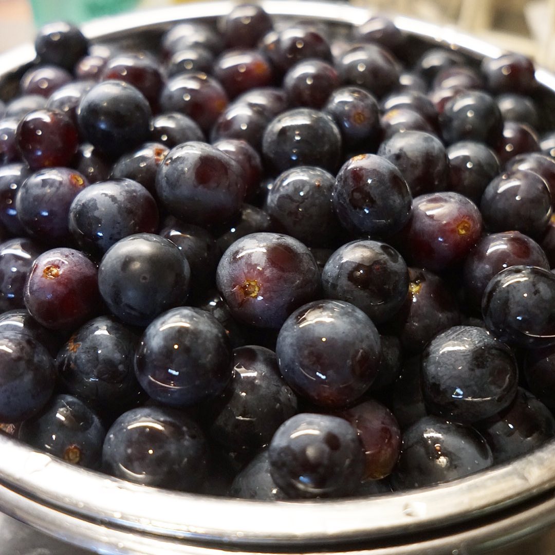 さっと洗ってざるにもりもりはブルーベリーじゃなくてぶどうだよ!と、このあとバナナとお砂糖と合わせてりんご酢に漬け込んで次の自家製ミックスフルーツ酢に!今お出ししているのはパイナップルとバナナで南国風味ですよ〜!(お)