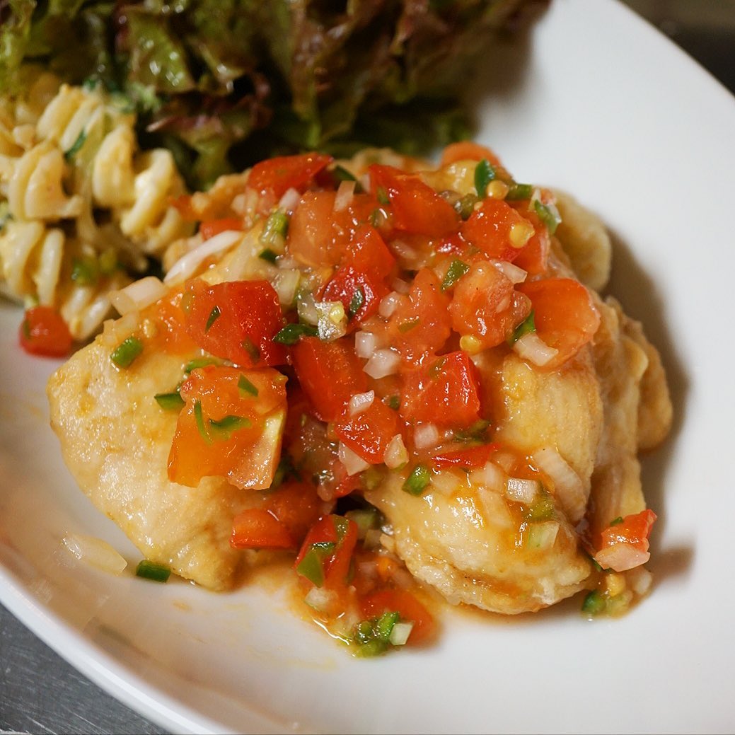 さてと明日のお昼時日替わりのひとつがこちら!「和風サルサチキン」!前は鶏肉をソテーしてたんですけど、お弁当以来さっくり揚げてオリジナルの和風サルサソースでさっぱりスパイシーにいただきますよ!(お)