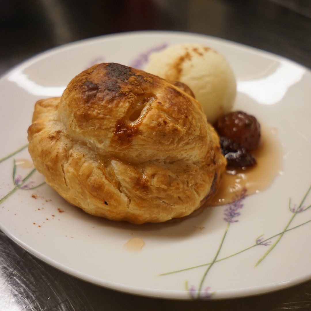 さてと11月から年末まで今年最後の季節のデザートはおまちかね!「アップルパイ・アイスクリーム添え」!甘さ控えめさわやかな紅玉りんごのアップルパイはあつあつに、甘くてひんやりアイスクリームのコントラスト!自家製いちごジャムを添えて!(お)