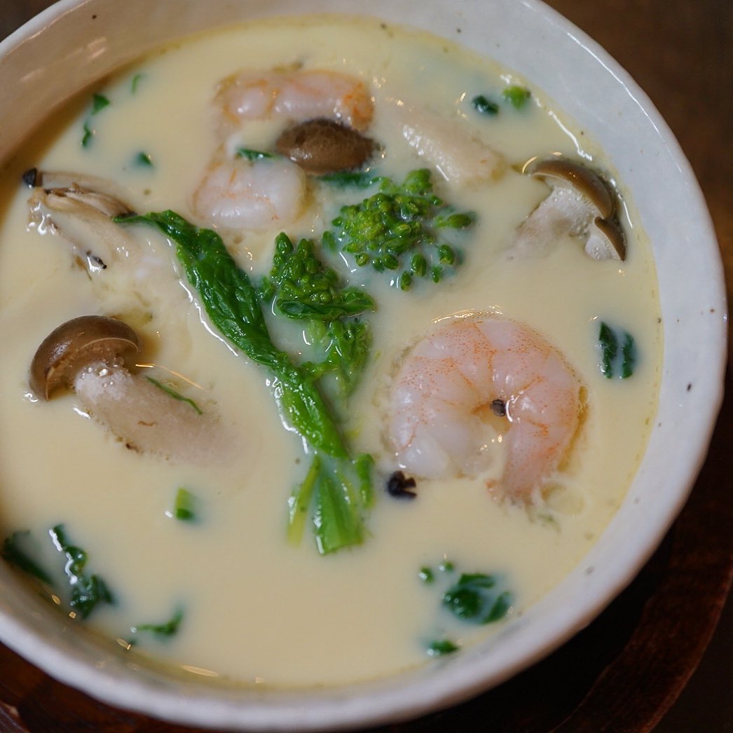 和風だったらなんたって「菜の花とエビの茶わん蒸し」!いや、春のほろ苦菜の花とぷりぷりエビのおいしさ!…って、しかしワタクシ、なによりやさしいだし汁と玉子のあつあつのベース部分がなによりダイスキっ!(笑)(お)
