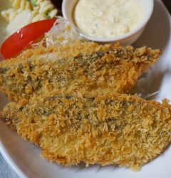 からりとお魚揚げものは「アジフライ(タルタルソース添え)」!いや、三枚におろしたアジはシンプルにアジフライ!あつあつにとんかつソースに自家製タルタルソースのダブルがうれしい!(お)
