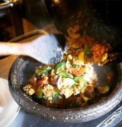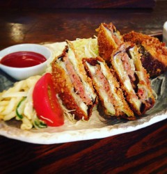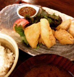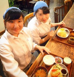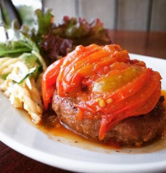 人気の夏ランチは「フレッシュトマトのハンバーグ定食」!トマト丸々一個分をいっしに焼いてのっけ盛り!そのままさっぱりソース代り!やさしいお味ですいすいたべられますよ!ぜひ!(お)