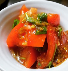 なつです!トマトの季節です!と「フレッシュトマトのナムル」!にんにくに生姜長ねぎの薬味にごま油を効かせたタレでざっくり乱切りトマトをさくさくたべよう!夏バテなんかぶっとばせ!(お)