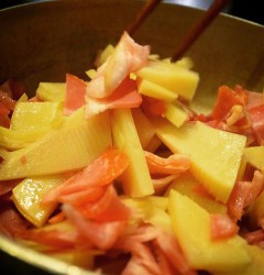 さてと当店今夜はこの春初たけのこ!…って毎年恒例の大人気メニューではないんですが、えぇ、まずはベーコンといっしょにざくざく炒めてしまいます!(すでにこの時点でおいしそう!…笑)(お)