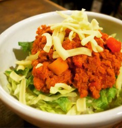 そして日曜の夜はみんなでわいわいたべたいごはんメニュー!「根菜タコライス」!ざくざく根菜の歯応え、トマトベースのスパイシーな具にさっくりレタス、チーズをトッピングしてわしわしたべよう!(お)