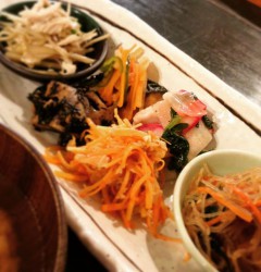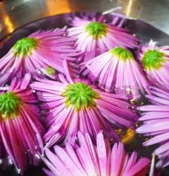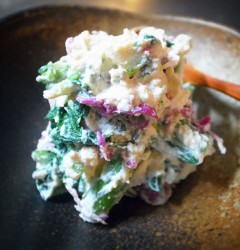 さてとたまにはしっとり和風のメニューもと、えぇ、先日きれいな花もお見せしましたが紫色の食用菊は「もってのほか」と独特な風味の春菊でまったり濃厚な白あえもよろしく(お)
