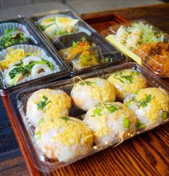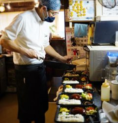 夜の部しょっぱなご予約ご注文はご家族のお弁当はハンバーグ弁当7つ!と、いや、実に仲良しなご家族ですね!と、ナベさんが並べて盛り付けは、並び切らなくてあと2つは別のトコっ!(笑)(お)