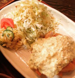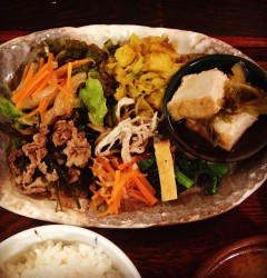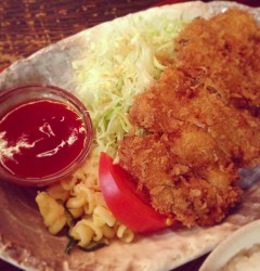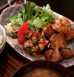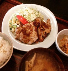 私の中で不動のナンバーワン「豚肉の香味焼き」。器で雰囲気が変わりますね、今日は洋食屋さん雰囲気の器でいただきます。行儀が悪いのは重々承知ですがタレをご飯にかけずには終われません。(うめ)