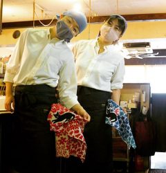 たまたまではあるけれどキッチンスタッフぐらと店長ミヤザキ手ぬぐいが色違いオソロだね!と、えぇ、ぐらの馴染みは沖縄ドゥカティさんの手ぬぐいですね!すてきだね!仲もイイネ!(笑)(お)