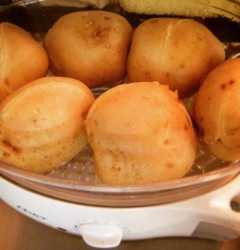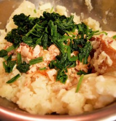 と、さっき蒸したじゃがいもはほぐした鮭とほうれんそうと合わせて「鮭とほうれんそうのコロッケ」!…今夜登場!すかっとひえひえ生ビールのおともに!ソースをだぼだぼかけてたべよう!(笑)(お)