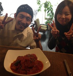 撮ってる私まで笑顔になりました笑。今日のまかないはランチのトマト煮にハンバーグがドカンと入ったスペシャルメニューでした!食べ応え満点です。トマトハンバーグを前にこの笑顔のお二人。(うめ)