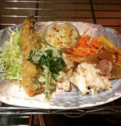 今日のまかないは 色鮮やか!なべさんが買って来てくれた、最近できたというイタリアンお惣菜屋さんのおかずも入ってますよ〜。丸皿に入ったクスクスのサラダと、右下の鳥肉のレモンマリネ、いただきます!(コジ)