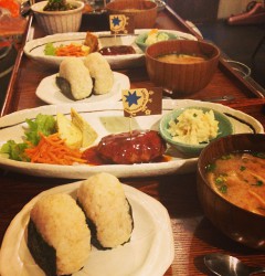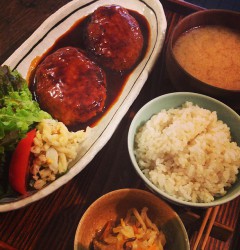 ハンバーグがどうしても、一つじゃ足りない!という育ち盛の男の子。ハンバーグ2枚焼いて乗っけて!とのリクエスト。1300円の特別ハンバーグ定食でお受けしました*(^o^)/*大きくなれよー!(麻)